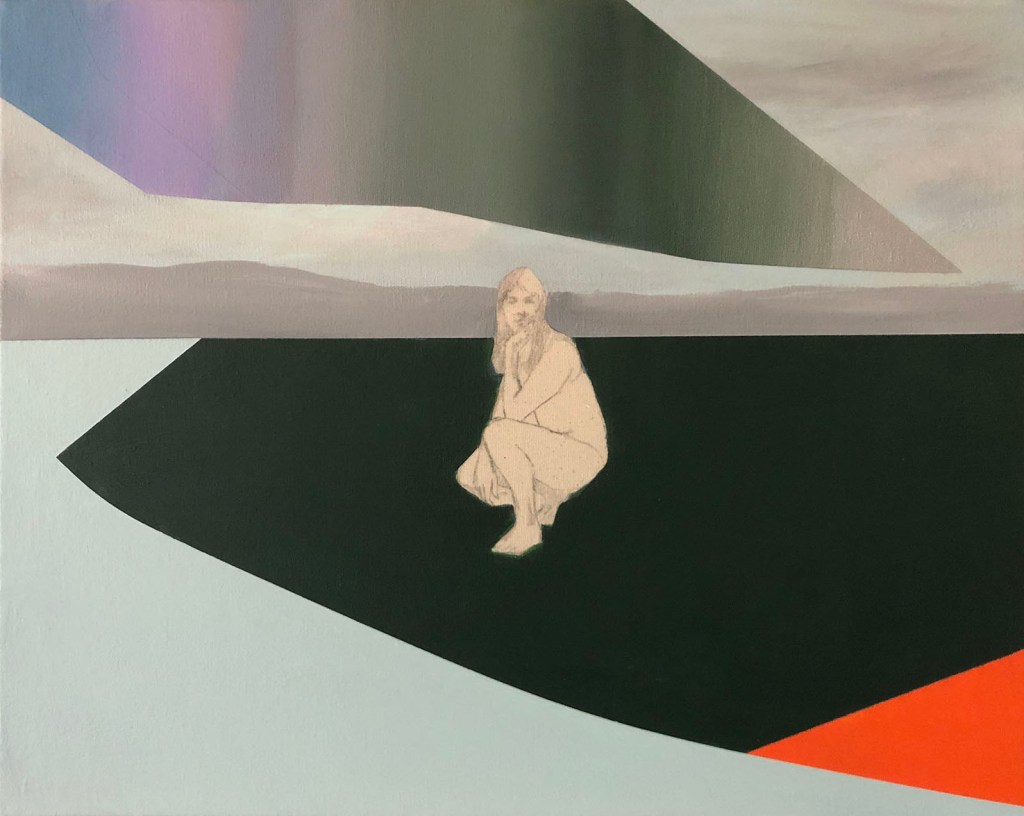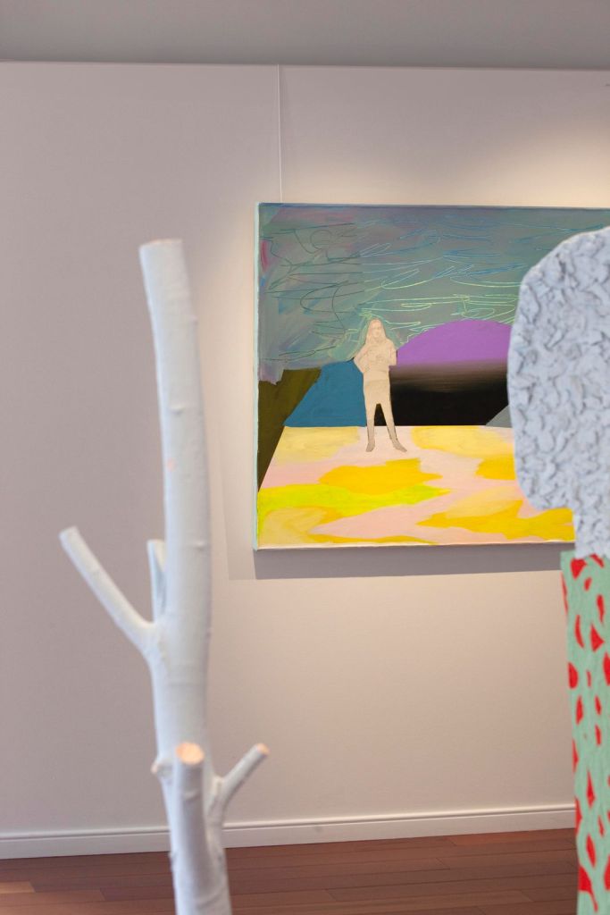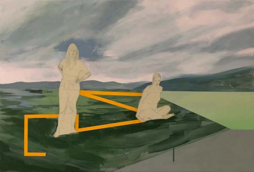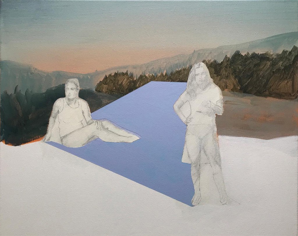 Les dessins de femmes qui sont au centre de mes compositions sont réalisés à partir de portraits photographiques montrant mes copines dans des moments anodins de rencontres. Ces scènes où se retrouvent les figures féminines évoluant dans des univers énigmatiques, évoquent de manière poétique l’idée d’une nature sensible et changeante. Sans jamais offrir de représentation claire, ce travail, tout en étant une exploration visuelle, devient un espace de réflexion sur la place de la femme dans un monde naturel de plus en plus éclaté et complexe.
